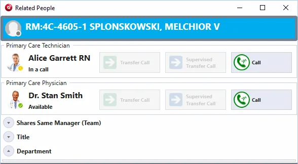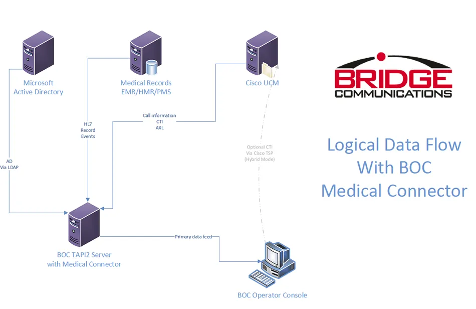 Bridge Communications Medical Connector brings EMR and HMR integration to the Attendant Console. As always, operators can search by specialty, department or shifts but now operators can now transfer callers directly to patient rooms without switching programs or needing direct access to EMR/HMR systems. Lower your HIPAA security exposure and your EMR per seat licensing costs. Increase caller satisfaction and reduce call queue length and operator staffing needs by quickly and accurately moving calls from the operator console to the proper destination the first time.